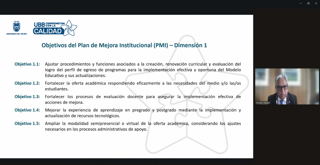 A continuación, el vicerrector académico Dr. Sergio Vargas profundizó en el trabajo que se está realizando, como parte del Plan de Mejora, en la dimensión de docencia y resultados del proceso de formación, que abarca criterios relativos al modelo educativo, los procesos y resultados de aprendizaje, el cuerpo académico y la innovación docente. En su exposición, Vargas detalló los avances a la fecha en los cinco objetivos definidos, asociados a la implementación de la actualización del modelo educativo, la oferta académica, la evaluación docente, la experiencia formativa y los recursos tecnológicos, además de la educación virtual. Entre otros avances, citó la constitución del Comité de Evaluación de Oferta Académica, la revisión y actualización de los procedimientos para la creación, renovación y cierre de programas de pregrado y postgrado, así como el diseño de mecanismos de seguimiento y evaluación curricular. Se refirió también a laarticulación de los programas de acompañamiento estudiantil y a la elaboración de un sistema de alerta universal para mejorar la efectividad de las estrategias de apoyo académico.