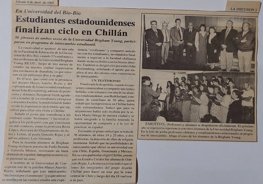 En esta línea, el académico del Departamento de Artes y Letras, Dr. Federico Pastene, aportó antecedentes históricos referidos a la primera visita de Brigham Young University realizada en 1995. En aquella oportunidad, según reportaba el Diario La Discusión, 37 estudiantes permanecieron durante 3 meses en nuestra UBB junto al representante John Rossemberg. La directora del Departamento de Artes y Letras de la época era la académica Berta López y entre los docentes que impartieron clases se contó a los poetas Sergio Hernández y Gonzalo Rojas y el artista plástico Luis Guzmán. El decano de la época, Marco Aurelio Reyes, señaló que ese intercambio resultó ser una experiencia vivificante.