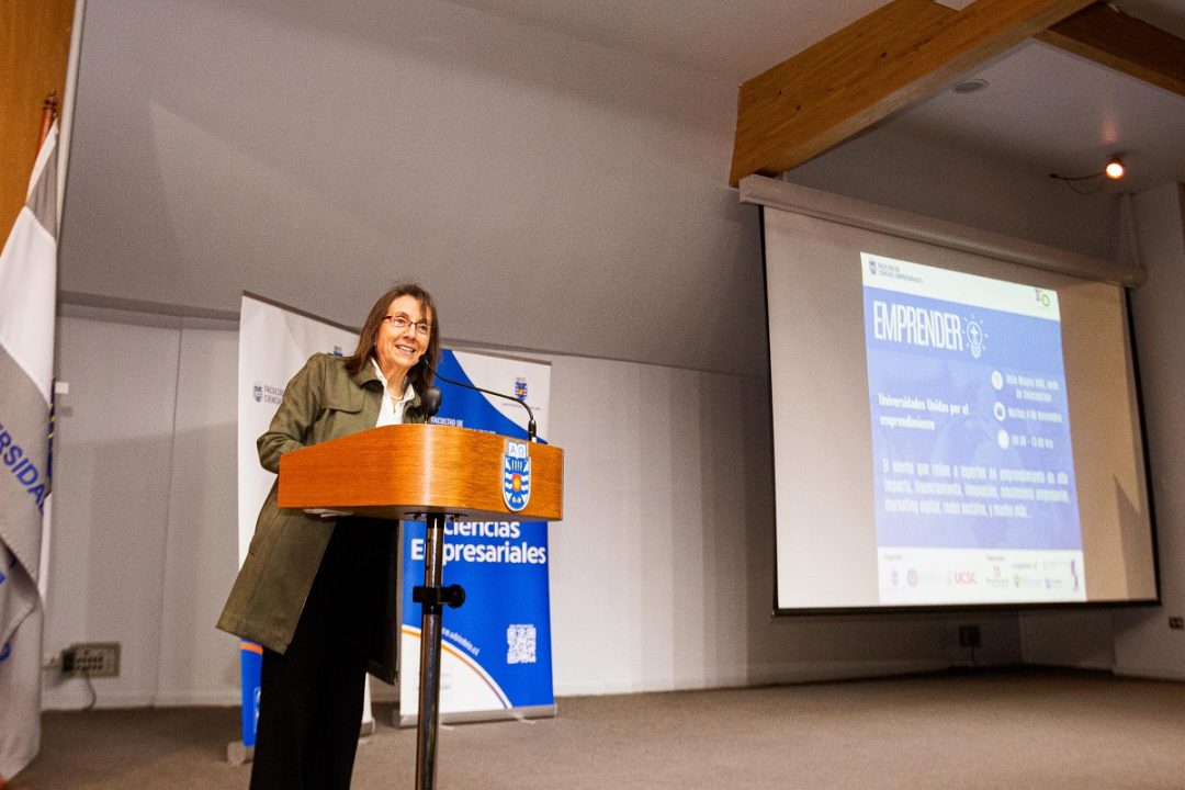 La decana de la Facultad de Ciencias Empresariales, Dra. Elizabeth Grandón Toledo, destacó en sus palabras de bienvenida la importancia del trabajo colaborativo, “la idea es aprender juntos e inspirarse. Los vínculos y las relaciones son fundamentales para todo tipo de trabajo que ustedes (estudiantes) realizarán en el futuro. Es importante generar estos espacios, donde se conozcan referentes del ecosistema de emprendimiento”.
