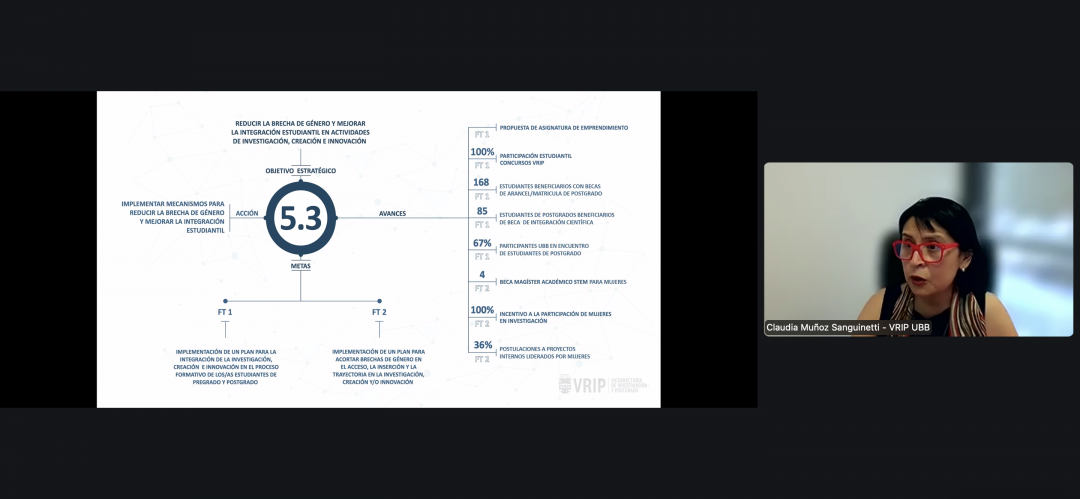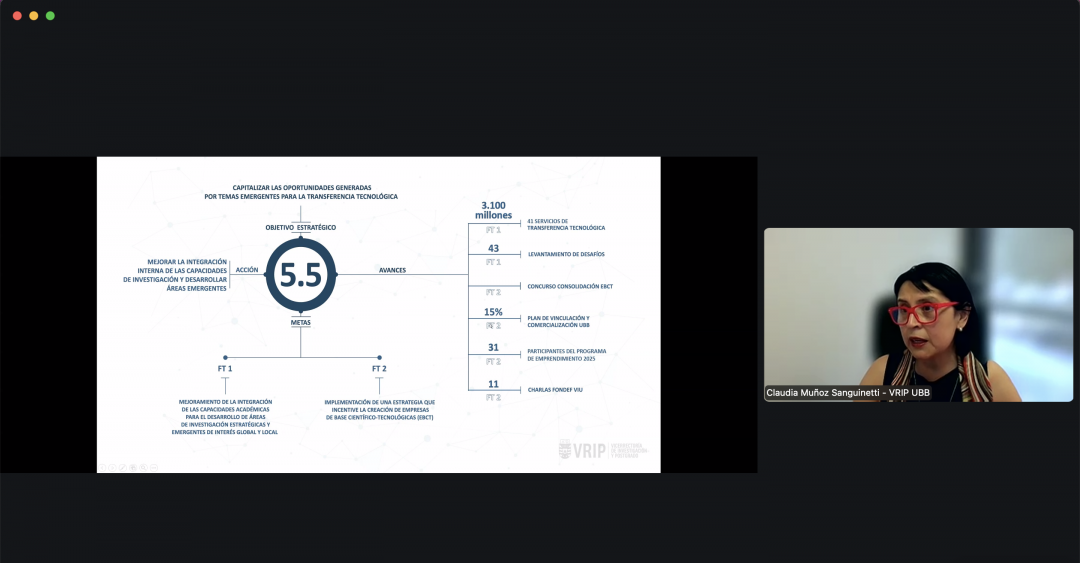 La presentación central estuvo a cargo de la vicerrectora de Investigación y Postgrado, Dra. Claudia Muñoz Sanguinetti, quien expuso los avances, metas y desafíos asociados a los cinco objetivos estratégicos del PMI en esta dimensión, Mencionó resumidamente: Resguardar y potenciar la productividad académica, a través de la implementación de una estrategia comunicacional para visibilizar impactos de investigación, creación e innovación. Articulación entre vicerrectorías para fortalecer condiciones de productividad, y trabajo con facultades y departamentos para perfilar adecuadamente nuevos concursos académicos. Apoyo en I+D+i+e, a través del desarrollo de un modelo institucional para medir impacto en investigación y creación. Avances en la digitalización de procesos y fortalecimiento del soporte administrativo. Instalación de un encargado especializado para compras científicas complejas en ambas regiones, y diagnóstico institucional sobre áreas de investigación, productividad y oportunidades de colaboración. Incrementar la adjudicación de fondos externos y redes colaborativas, capitalizar oportunidades en áreas emergentes y transferencia tecnológica
