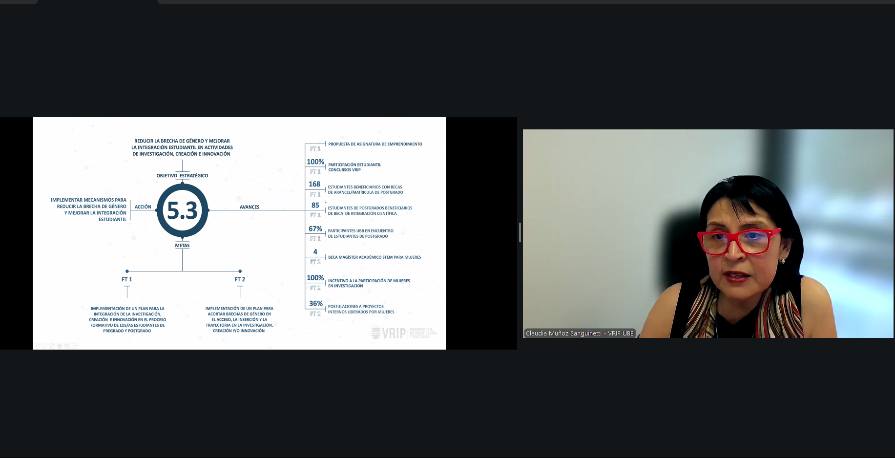 La presentación central estuvo a cargo de la vicerrectora de Investigación y Postgrado, Dra. Claudia Muñoz Sanguinetti, quien expuso los avances, metas y desafíos asociados a los cinco objetivos estratégicos del PMI en esta dimensión, Mencionó resumidamente: Resguardar y potenciar la productividad académica, a través de la implementación de una estrategia comunicacional para visibilizar impactos de investigación, creación e innovación. Articulación entre vicerrectorías para fortalecer condiciones de productividad, y trabajo con facultades y departamentos para perfilar adecuadamente nuevos concursos académicos. Apoyo en I+D+i+e, a través del desarrollo de un modelo institucional para medir impacto en investigación y creación. Avances en la digitalización de procesos y fortalecimiento del soporte administrativo. Instalación de un encargado especializado para compras científicas complejas en ambas regiones, y diagnóstico institucional sobre áreas de investigación, productividad y oportunidades de colaboración. Incrementar la adjudicación de fondos externos y redes colaborativas, capitalizar oportunidades en áreas emergentes y transferencia tecnológica