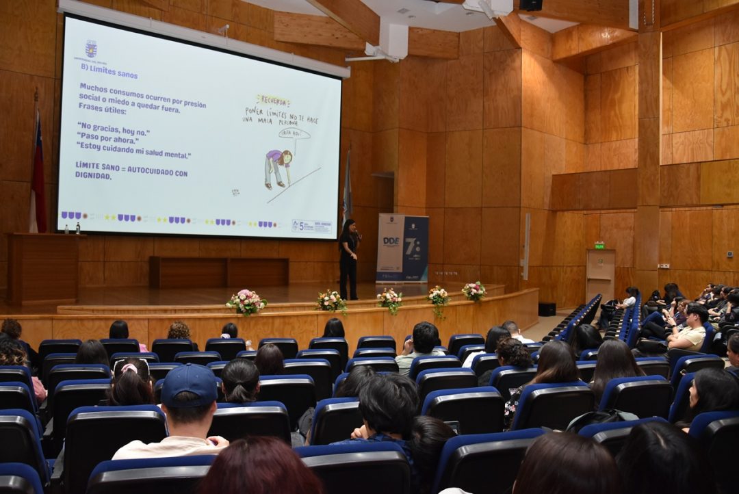 La trabajadora social del Departamento de Bienestar Estudiantil Camila Molina, coordinadora del Programa Consciente y Sin Riesgos de la Universidad del Bío-Bío, durante su presentación destacó que este programa busca promover prácticas de bienestar y autocuidado en la comunidad estudiantil, fomentando una toma de decisiones informadas frente al consumo de alcohol y otras drogas. «Nuestro enfoque no es prohibitivo, sino educativo y preventivo, orientado a generar consciencia, validar la capacidad de decisión de los estudiantes y comprender los motivos detrás del consumo», explicó Molina. Además, subrayó la importancia de informar sobre los riesgos del consumo excesivo, incentivar el buen uso de los espacios universitarios y fortalecer los factores protectores dentro de la comunidad estudiantil.