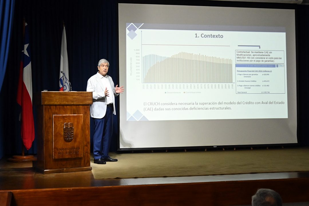 Durante su presentación, el rector de la Universidad de Concepción Dr. Carlos Saavedra, planteó la necesidad de avanzar en la superación del modelo de Crédito con Aval del Estado (CAE), señalando que, desde la perspectiva del Consejo de Rectores de las Universidades Chilenas (CRUCH), se trata de un instrumento con deficiencias estructurales ampliamente conocidas. A su juicio, si bien el CAE permitió una expansión del sistema de educación superior desde su implementación en 2006, fue concebido originalmente para un universo acotado de entre 20 mil y 40 mil estudiantes, lo que derivó posteriormente en un crecimiento no orgánico, sin adecuados mecanismos de regulación, contención ni resguardo del gasto fiscal.