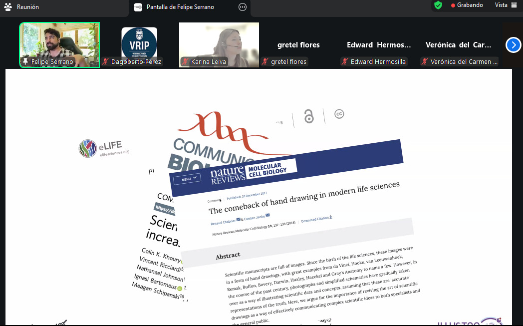 La charla principal estuvo a cargo del ilustrador científico Felipe Serrano González, magíster en Ciencias Biológicas con mención en Biología Celular y Molecular de la Pontificia Universidad Católica de Chile y diplomado en Diseño Editorial de la Universidad de Chile. Serrano, además, es creador de https://illustrascilab.com/, cuenta con una trayectoria que integra ciencia y diseño, lo que le ha permitido trabajar en ilustración científica, infografías, portadas de revistas especializadas y proyectos de divulgación.