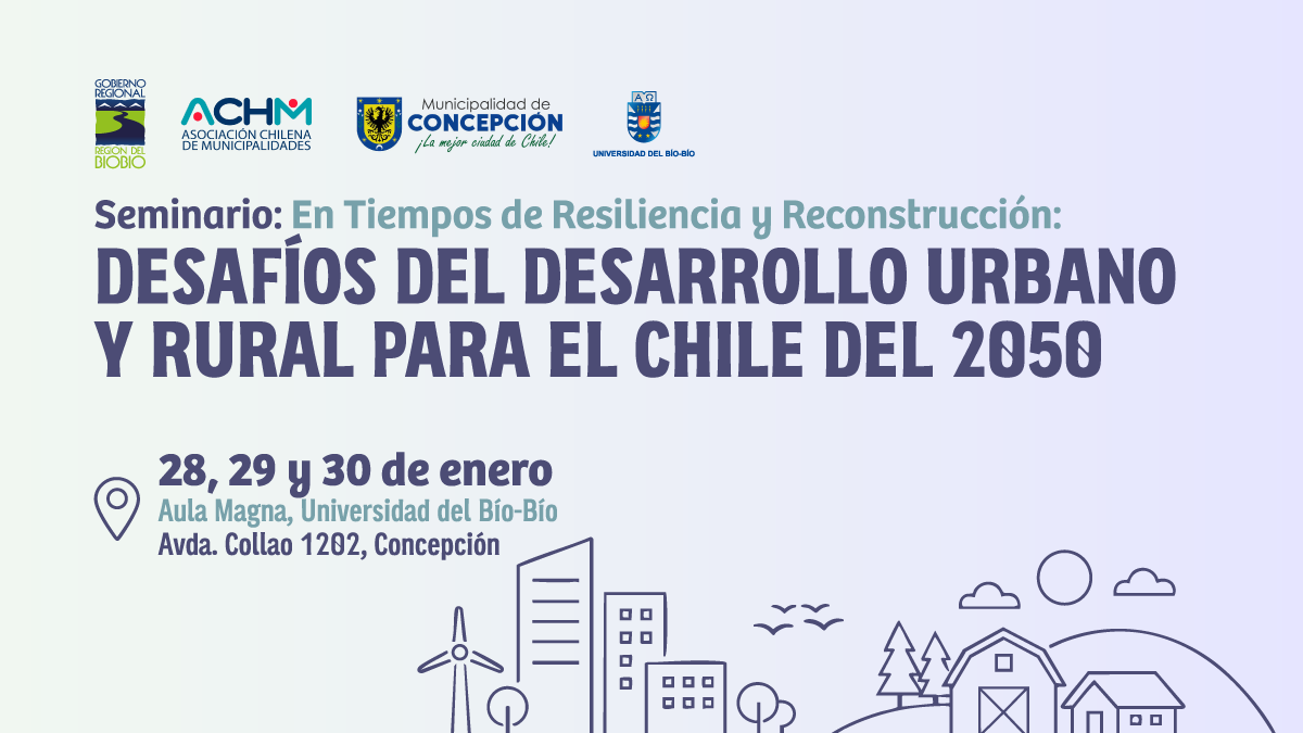 En el Aula Magna de nuestra Universidad en Concepción tendrá lugar el seminario «En tiempos de resiliencia y reconstrucción: desafíos del desarrollo urbano y rural para el Chile del 2050». El encuentro organizado por la Asociación de Municipalidades de Chile (AChM), con apoyo de la UBB, la Municipalidad de Concepción y el Gobierno Regional del Biobío. El encuentro se llevará a cabo el miércoles 28, jueves 29 y viernes 30 de enero y tiene como propósito abrir un espacio de reflexión y diálogo en torno a los principales desafíos que enfrenta nuestro país en materia de vivienda, ciudad y territorio.