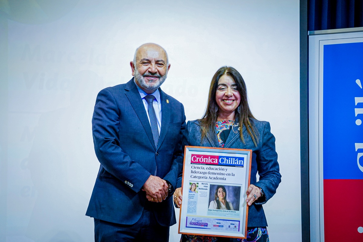 En reconocimiento a su destacada trayectoria académica, científica y sus aportes al desarrollo del territorio, la académica de la Universidad del Bío-Bío, Dra. Marcela Vidal Maldonado, del Departamento de Ciencias Básicas, fue galardonada con el premio “Mujer Protagonista”, iniciativa impulsada por Diario Crónica Chillán y la UBB.